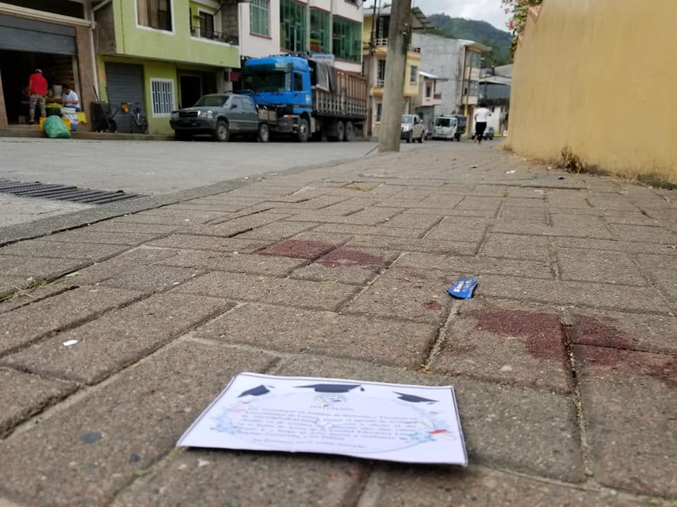 Manchas de sangre donde aterrizó el cuerpo de D Suárez junto a tarjeta de invitación a evendo de graducación