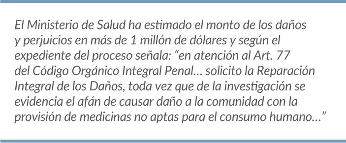 El Ministerio de Salud ha estimado el monto de los daños y perjuicios en más de 1 millón de dólares y según el expediente del proceso señala: “en atención al Art. 77 del Código Orgánico Integral Penal… solicito la Reparación Integral de los Daños, toda vez que de la investigación se evidencia el afán de causar daño a la comunidad con la provisión de medicinas no aptas para el consumo humano…” Por lo tanto, las expectativas respecto a las sanciones incluye también el resarcimiento económico de los daños con el fin de que se cubra incluso la destrucción de los medicamentos falsificados y caducados con el fin de evitar que estos salgan a comercializarse y causen daños graves a la salud y también para precautelar el medio ambiente, pues deben ser destruidos bajo estándares específicos que tienen un costo. De hecho en las audiencias previas se ha mencionado los daños que pudo ocasionarse a la ciudadanía y se ha señalado que es un tema de conmoción social porque atenta a un bien protegido por la Constitución que es la salud de la población. Sin embargo desde la misma Fiscalía no se ha abierto el abanico para delegar a otros fiscales de manera que conozcan estos otros presuntos delitos. El fiscal a cargo del caso es Jorge Cárdenas Verdezoto. Según ha reportado la prensa cuencana, la cartera de Salud ha dicho que “ el accionar del Ministerio en el caso tiene la finalidad de “precautelar y garantizar la salud de los ciudadanos”, y anunció que se efectúan controles permanentes por la Agencia de Regulación y Control Sanitario para evitar que se registren nuevos casos de adulteración de medicinas en Azuay. El expediente de este caso tiene más de 3.000 fojas que incluyen 152 informes técnicos de ARCSA, decenas de fotos y videos y se espera que todo esto sea valorado por el Tribunal.