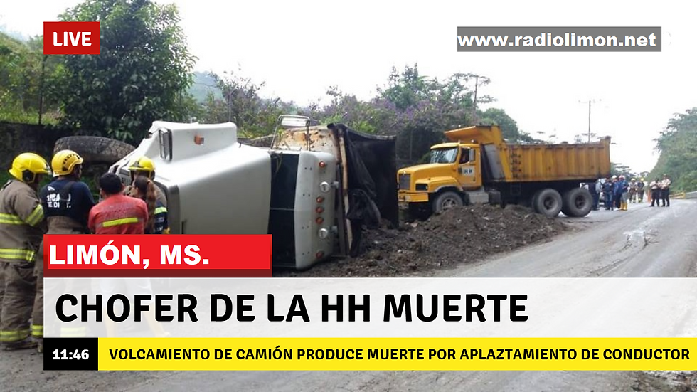 Producto de este percance, falleció el conductor de nombres Baroja Vega Francisco Amador de 74 años de edad, originario de la provincia de Imbabura, quien cuando el pesado vehíulo se viraba, intentó salir de el con mala fortuna, cayendo debajo de este. Elementos del Cuerpo de Bomberos de Limón intentan extraer el cuerpo, mismo que será trasladado a la morgue de la ciudad.
