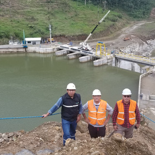 La primera foto desde la izquierda, muestra la unión del río Tablas con el Upano. Se aprecia, a las orillas del Tablas, las piedras de color amarillento. El día de nuestra visita era un día soleado y el río Upano llegaba hasta Macas, totalmente limpio. El Tablas tenía una turbiedad de un 7 por ciento, por lo cual, el Upano estaba totalmente limpio y en la cola de su represamiento (de unos 200 metros), las piedras bajo el agua se divisaban claramente. La foto del medio nos muestra un balde con agua. Esta muestra fue recogida el 13 de Enero de este año, y pese al trascurso de días, aún las partículas contenidas en el agua no se asientan por lo que esta sucia aún. En la foto de la derecha, personal de Hidronormandía y Jaime Tenezaca, director de Radio Limón en el centro.