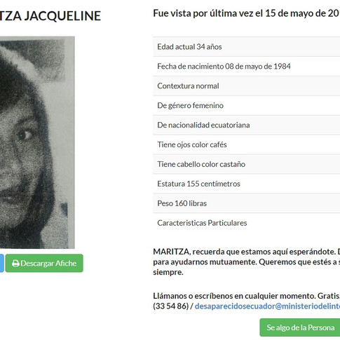 Maritza Jacqueline Punín Punín, pagó 15 mil dólares para viajar a USA. La última vez que la vieron con vida fue el 7 de Mayo del 2012 en Tocteloma, comunidad de Gualaceo.